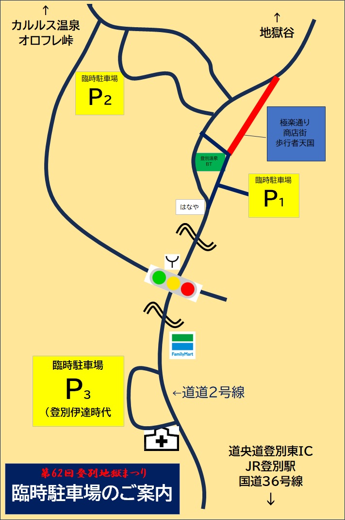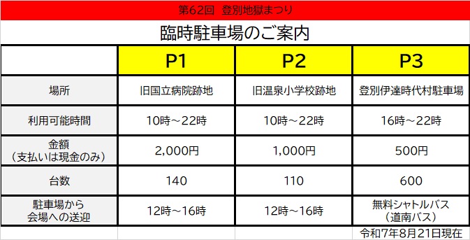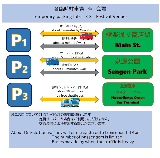 | 駐車場 | 第1駐車場(旧国立病院跡地) 第2駐車場(旧温泉小学校グラウンド) 第3駐車場(登別伊達時代村駐車場) *早い段階で満車になることが予想されます。公共交通機関のご利用をお勧めいたします。 |