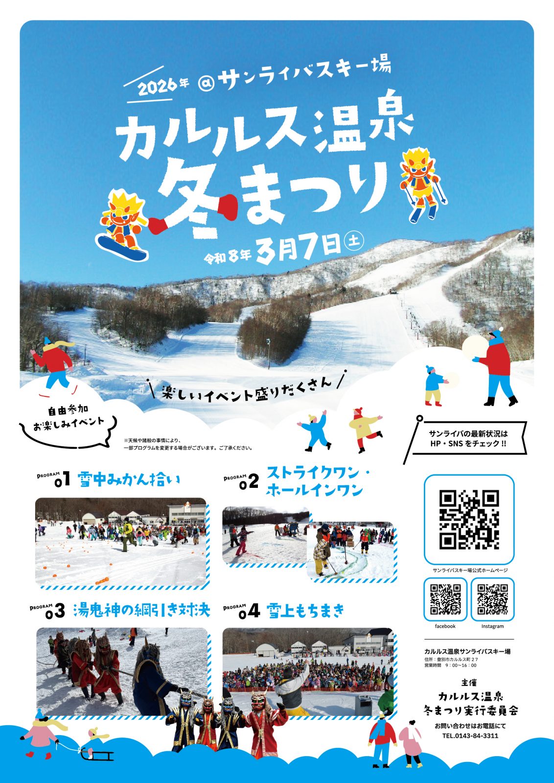 、ストライクワン(ボール投げ)、ホールインワン(雪上ゴルフ)、などちびっ子から大人まで家族みんなで気軽に参加できるイベント盛りだくさん!サンライバのゲレンデで残り少ない冬の一日を楽しみましょう!